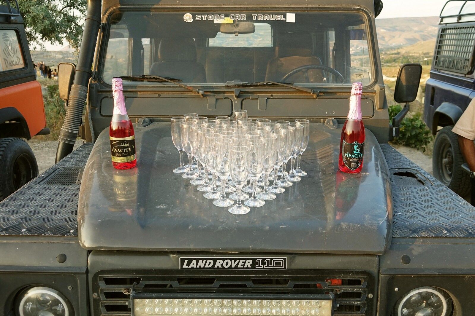 Peu avant que la nuit tombe et commence à recouvrir le paysage, ça se termine par un pot avec un vin pétillant, les touristes étant copieusement arrosés et que le soleil se couche. Beauf mais sympa...