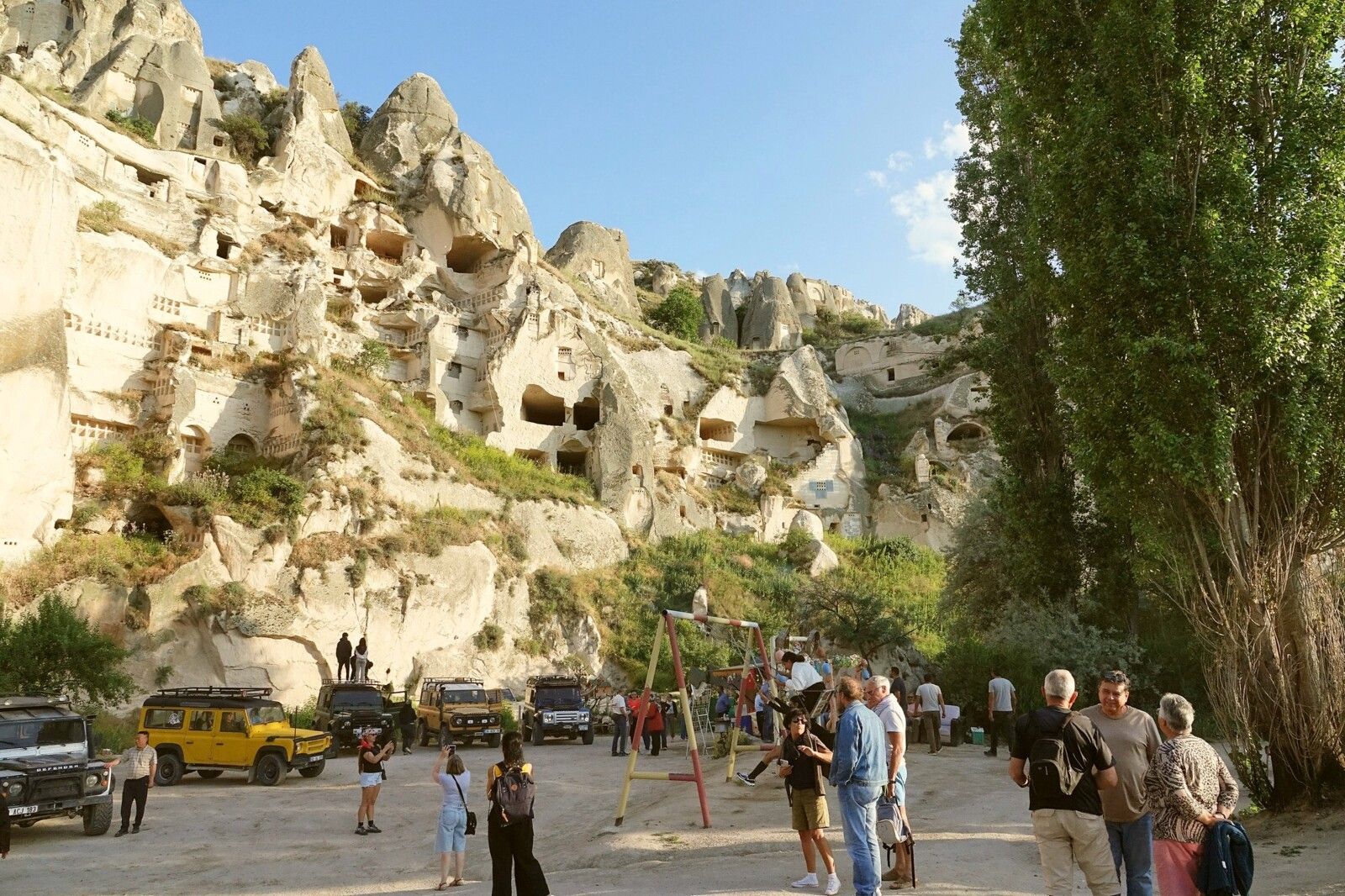 Nous arrivons à 18 heures à Nevşehir, la capitale de la Cappadoce où nous avons rdv avec des chauffeurs de 4x4 pour un safari dans le Parc national, un safari qui se terminera à la nuit tombée. On nous emmène dans des zones d'effondrement incroyable, dans divers coins très typiques de la Cappadoce avec son habitat troglodyte qui a fait sa réputation. Et pourtant, dans ces collines, dans ces falaises, des hommes, des femmes et des enfants ont vécu.