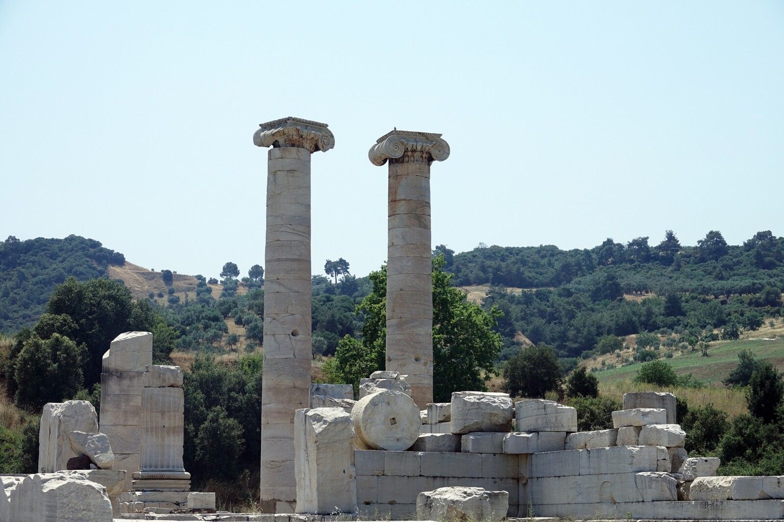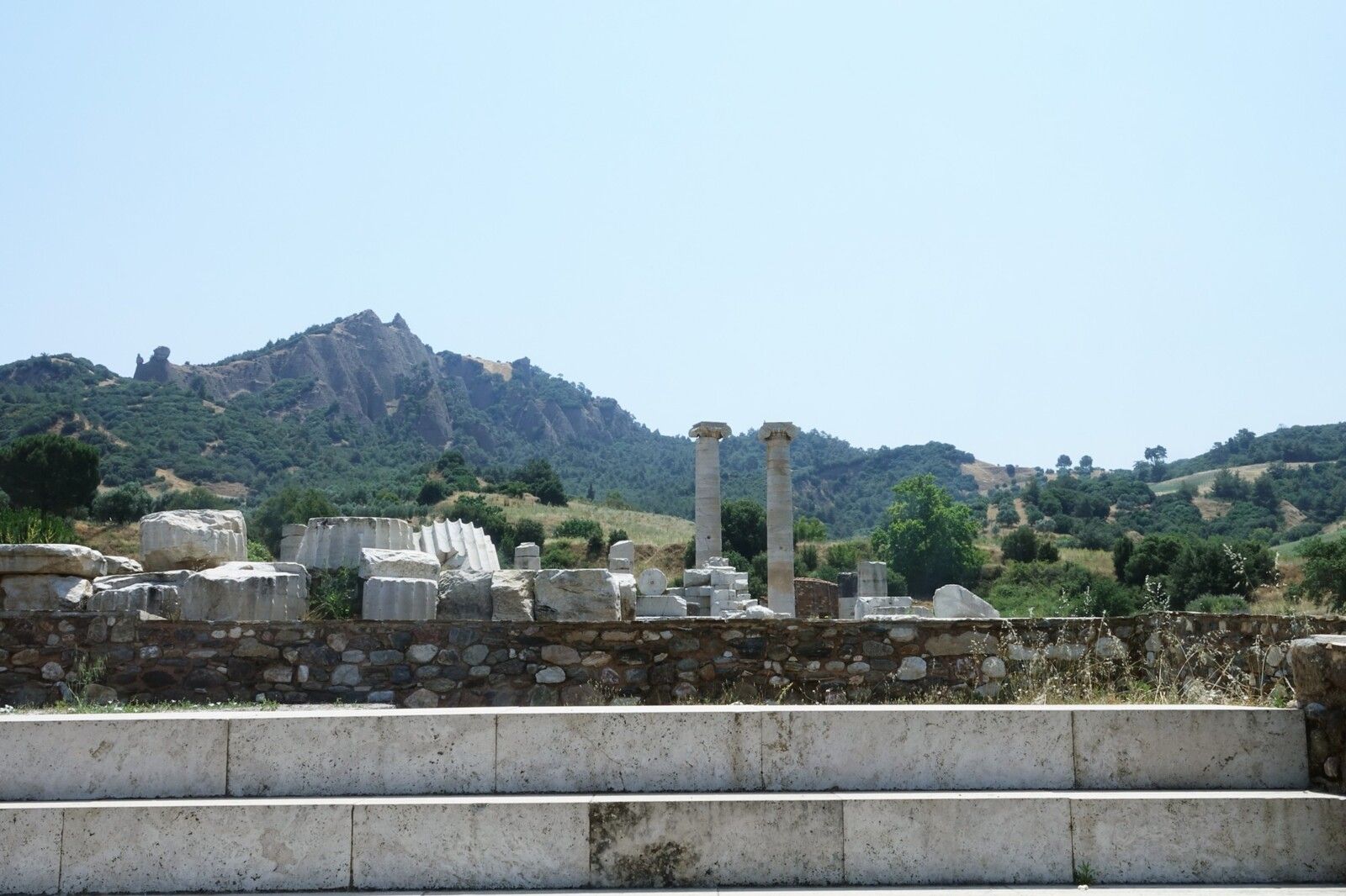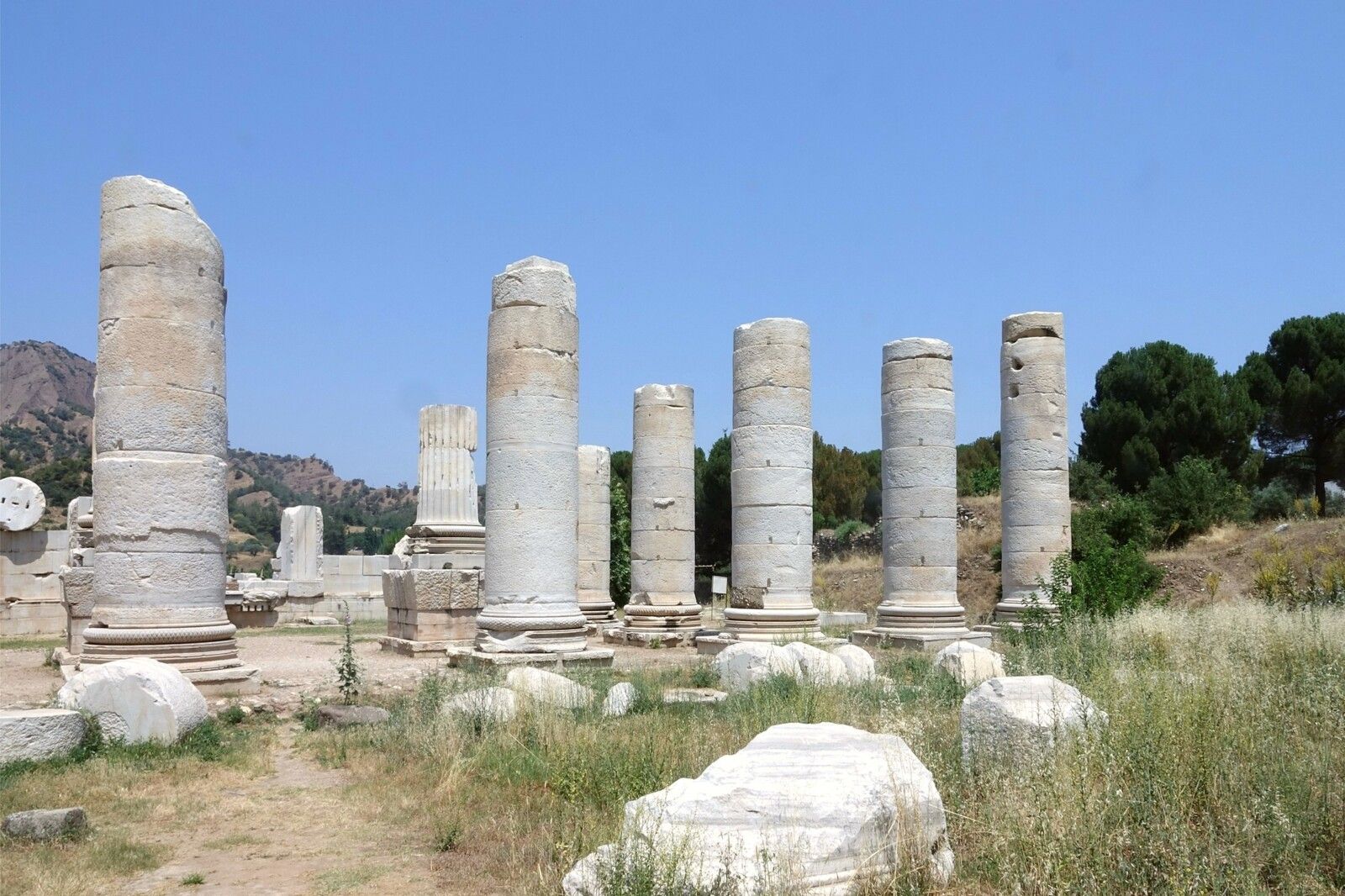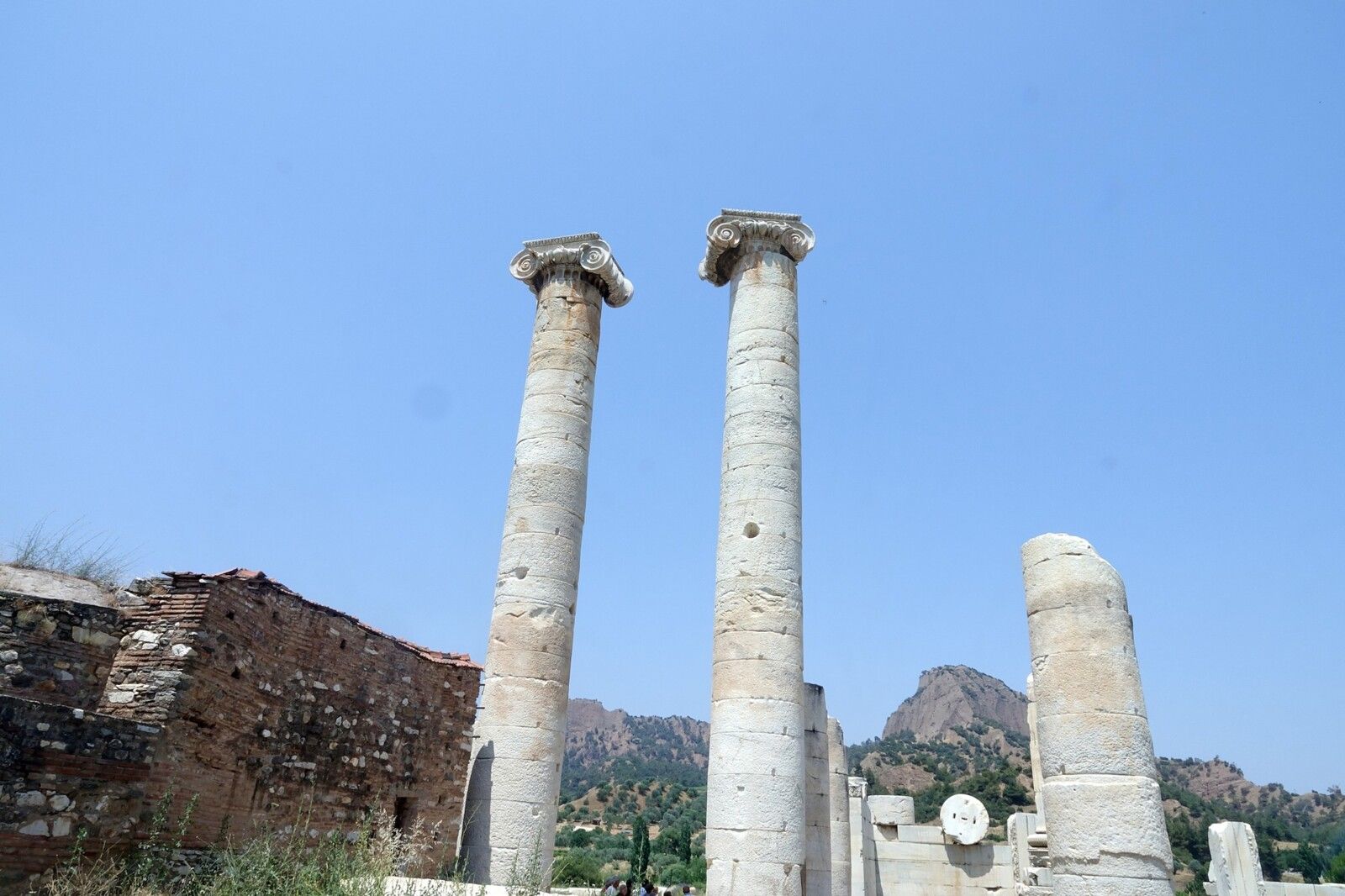 Non loin de la synagogue s’élevait le temple d'Artémis, bâti de façon spectaculaire sur les pentes occidentales de l'acropole, dans une large vallée menant à l'ancien lit de la rivière Pactole sous le mont Tmolus. Artémis était la déesse principale de Sardes et le temple qui lui était dédicacé était l’un des sept plus grands temples grecs (plus du double que celui du Parthénon). Elle était vénérée comme la déesse de la chasse, de la nature sauvage et de l'accouchement. Artémis était également considérée comme la protectrice des jeunes femmes et la gardienne du monde naturel. Malheureusement, un certain Hérostrate, a cherché la notoriété en détruisant ce qui a été considéré comme l'une des sept merveilles du monde antique. Il ne reste que des colonnes volumineuses.